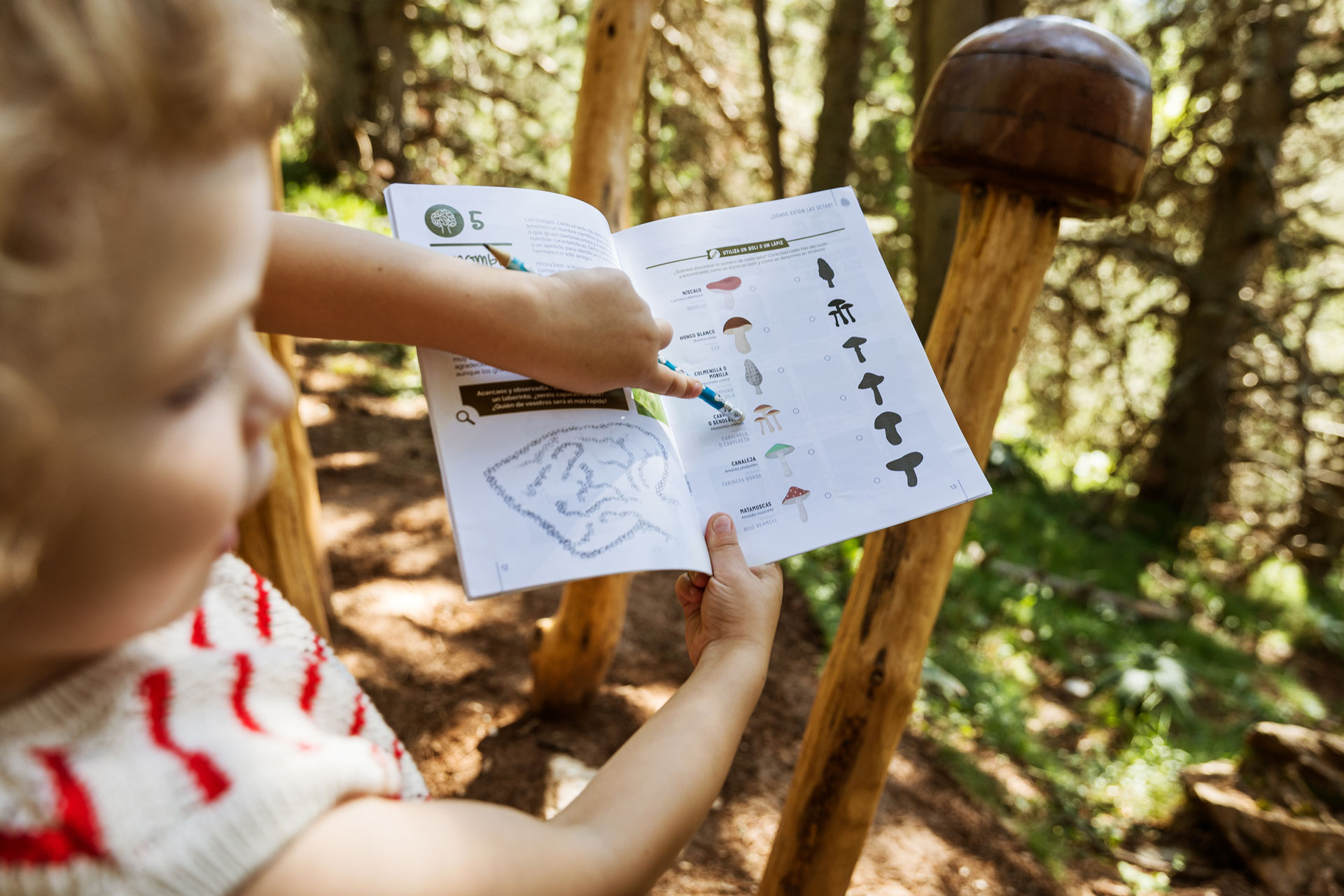 Cada itinerario es único y con un relato diferenciado: huellas explica las características de la fauna local, setas introduce conceptos de micología, brujas habla de leyendas del país… Este relato toma forma en una colección de libritos con juegos y propuestas lúdicas para cada camino.